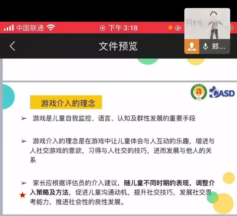 此外,为深化内力、提升教学水平,安安教育还开展了中心教师的线上培训,针对“孤独症康复教育的常用方法”“乐他乐康模式”“孤独症儿童的感觉信息处理”“孤独症儿童的言语沟通训练”“孤独症儿童的小肌肉发展及自理”“怎样执行IEP计划”等主题进行授课,同时总结学习心得、内化吸收,将所学知识应用于日常教学之中,为开学做好准备。